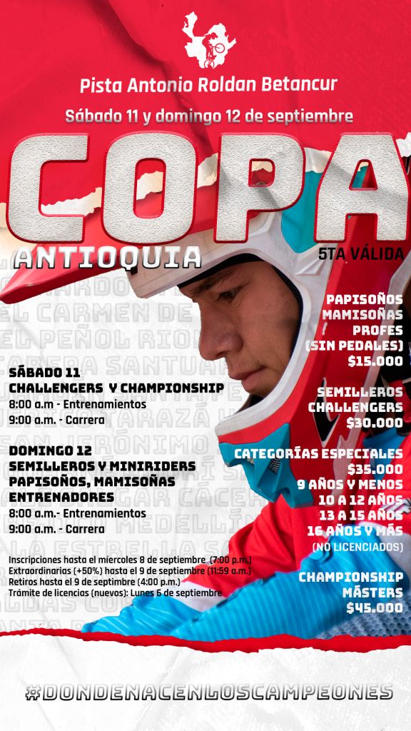 Cerrado este capítulo en El oriente, los pilotos antioqueños se alistan para vivir este sábado 11 de septiembre, la V Válida de la Copa Antioquia, que en esta ocasión se correrá en la renovada pista Antonio Roldán Betancur, siendo esta la primera carrera oficial que se realizará en la challenger, desde que esta fue intervenida con la capa de rodamiento por BMX Antioquia.