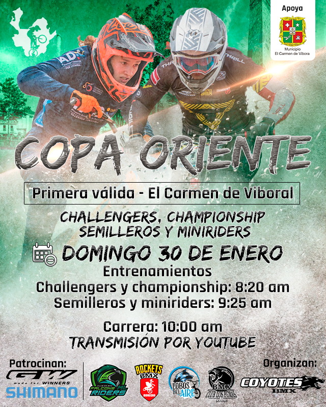 La primera válida de la Copa Oriente, tendrá los entrenamientos a las 8:20 a.m. para los challengers y championship, quienes darán paso a las 9:25 a.m. a los semilleros y miniriders. La carrera iniciará a las 10:00 a.m. y será transmitida por nuestro canal de YouTube.