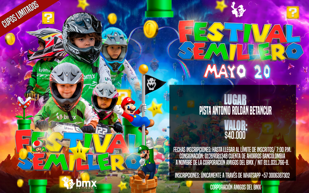 El próximo 20 de mayo, los más pequeños de nuestra disciplina se tomarán el partidor, las rectas y peraltes de la pista Antonio Roldán Betancur, lugar que acogerá el Gran Festival Semillero de Mario Bross de la Corporación Amigos del BMX de Antioquia.